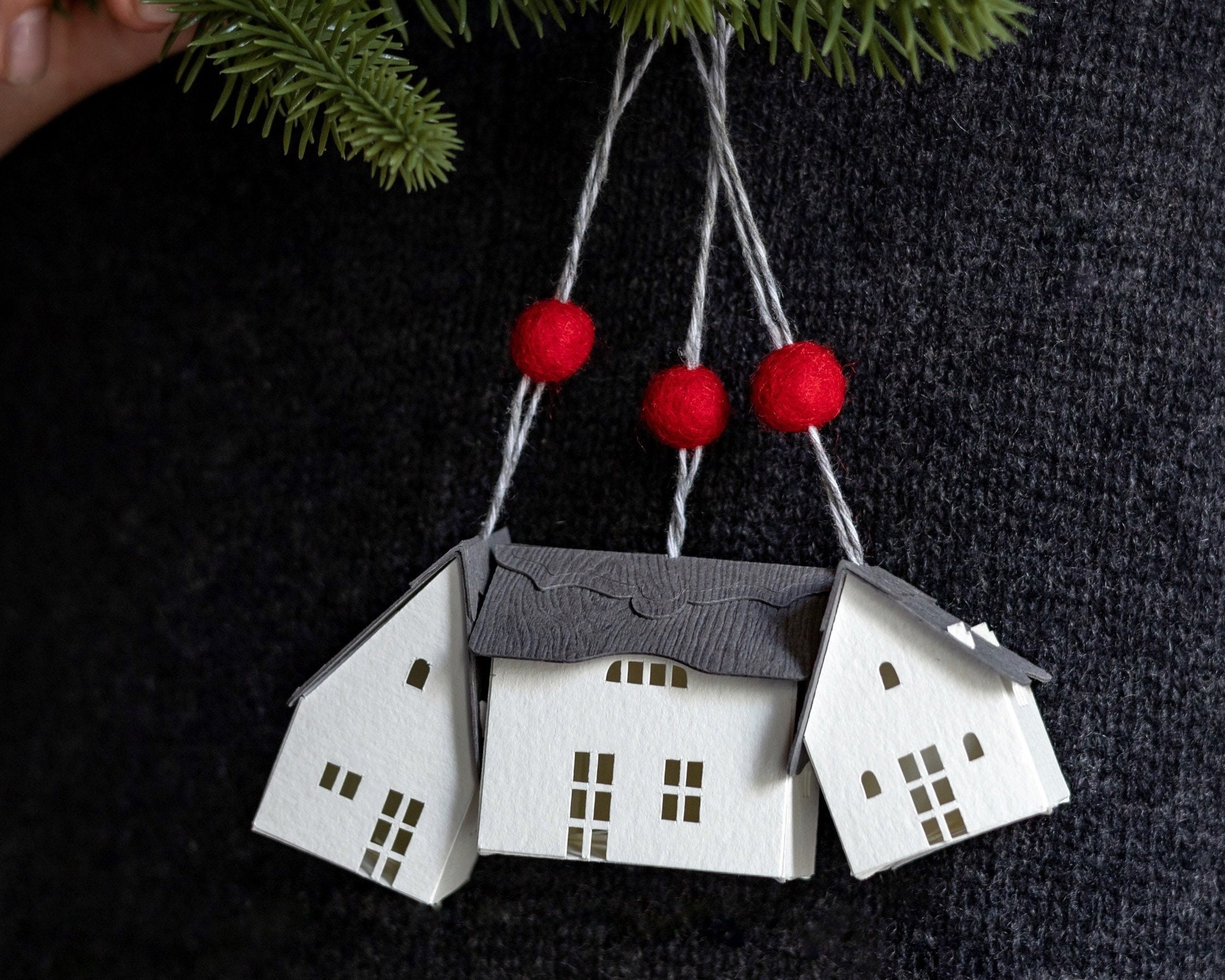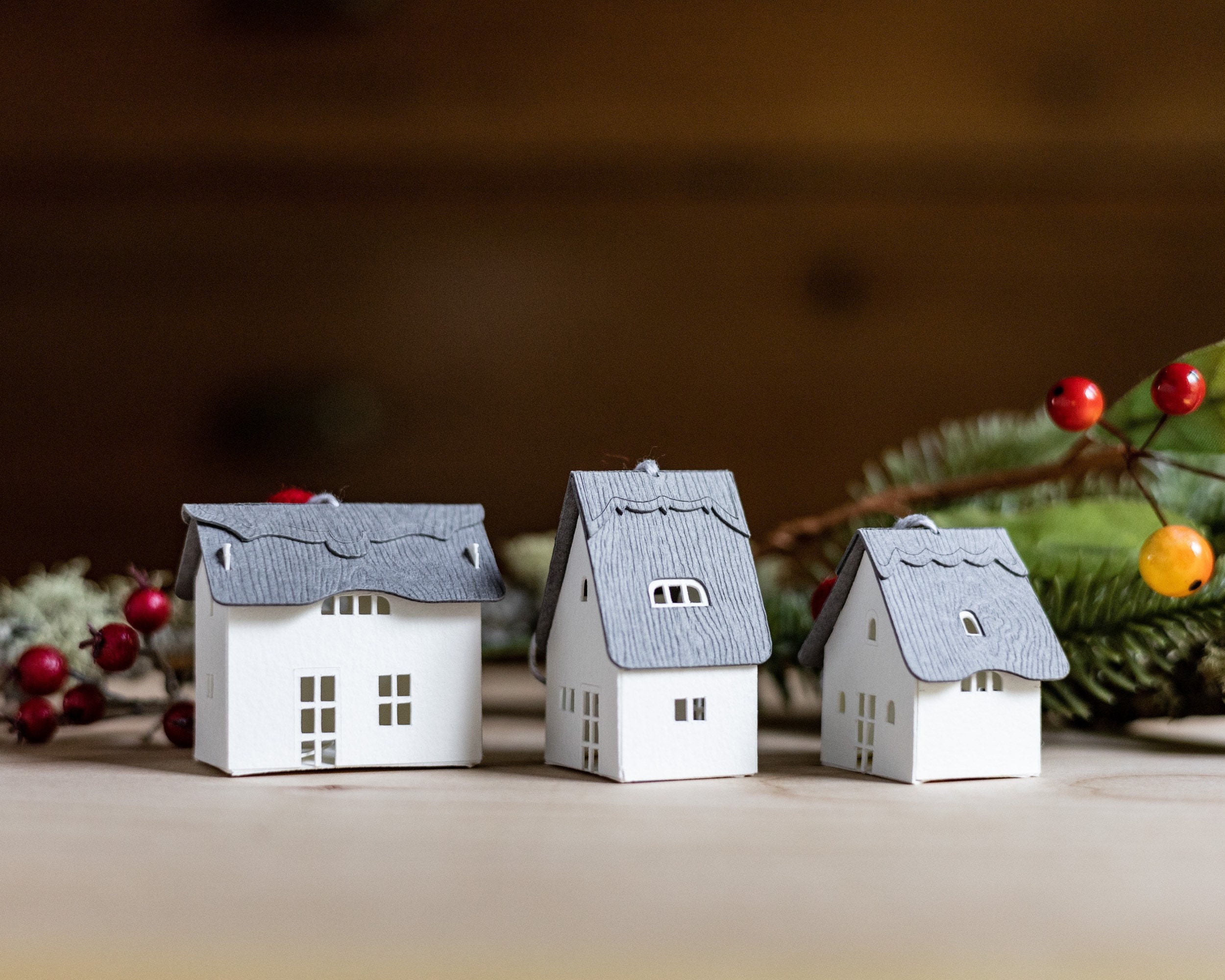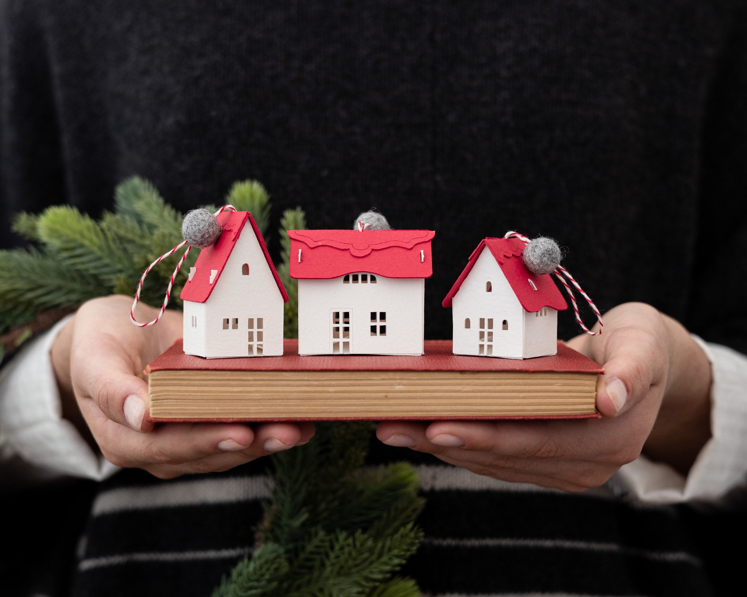 Handmade from creamy watercolor paper and accented with felted woolen balls, these ornaments range in size from 1.5 to 2 inches. Their distinctive thatched caps are inspired by the ones I fell in love with in the English Cotswolds.
