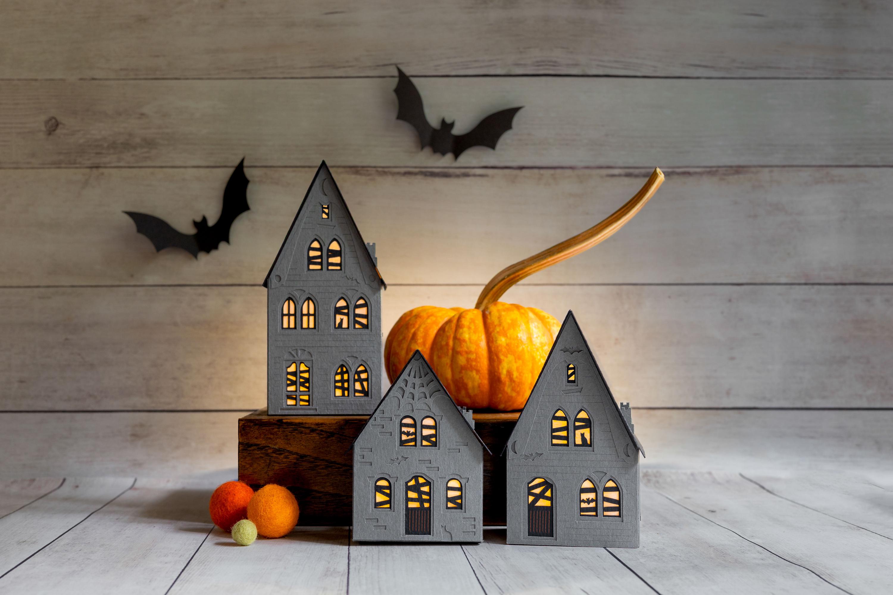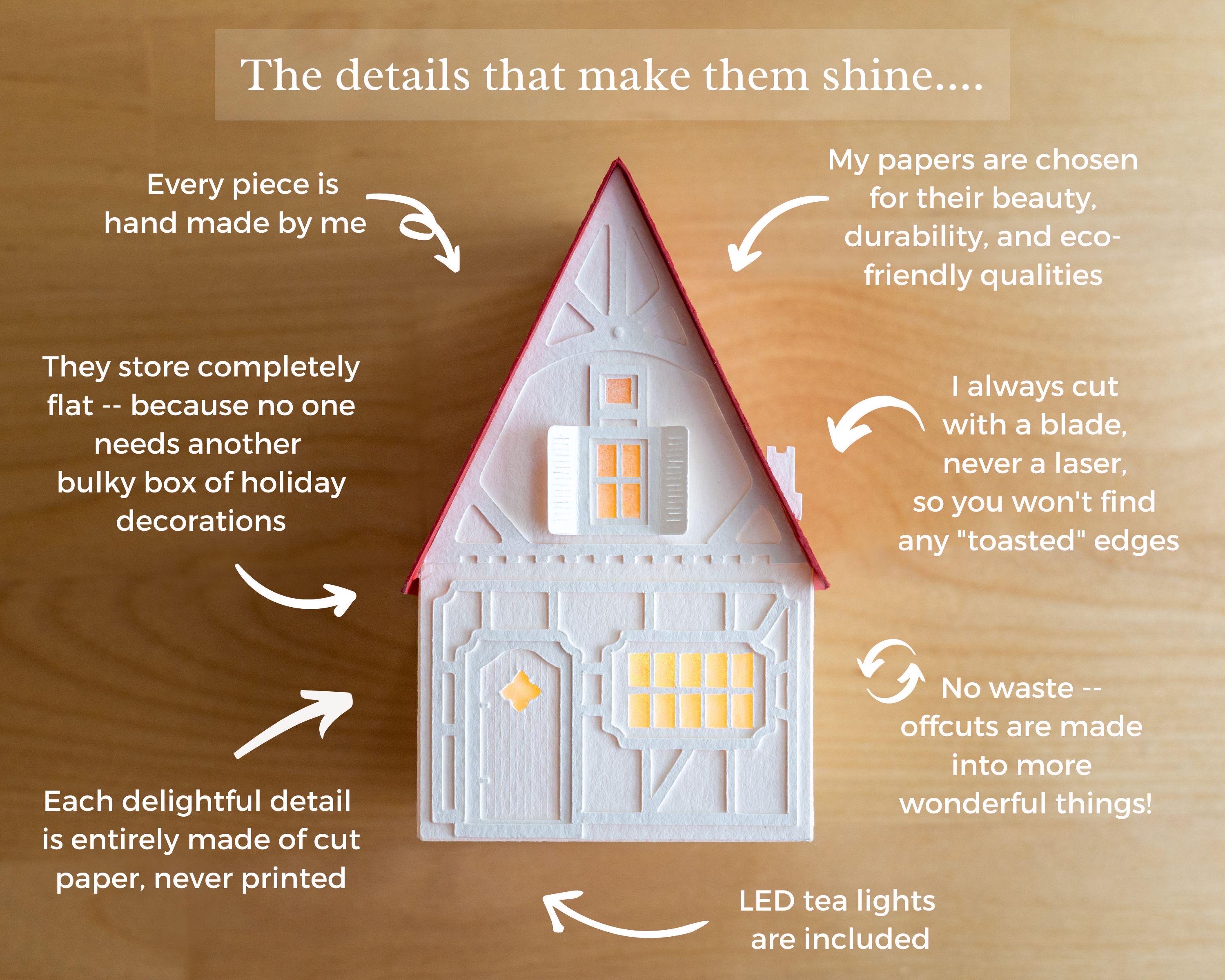 My paper luminaries always arrive fully assembled. Simply pop up the paper farmhouse, tuck in the LED faux tea light included with US shipments, and sit back to enjoy the warm and witchy glow. So easy!