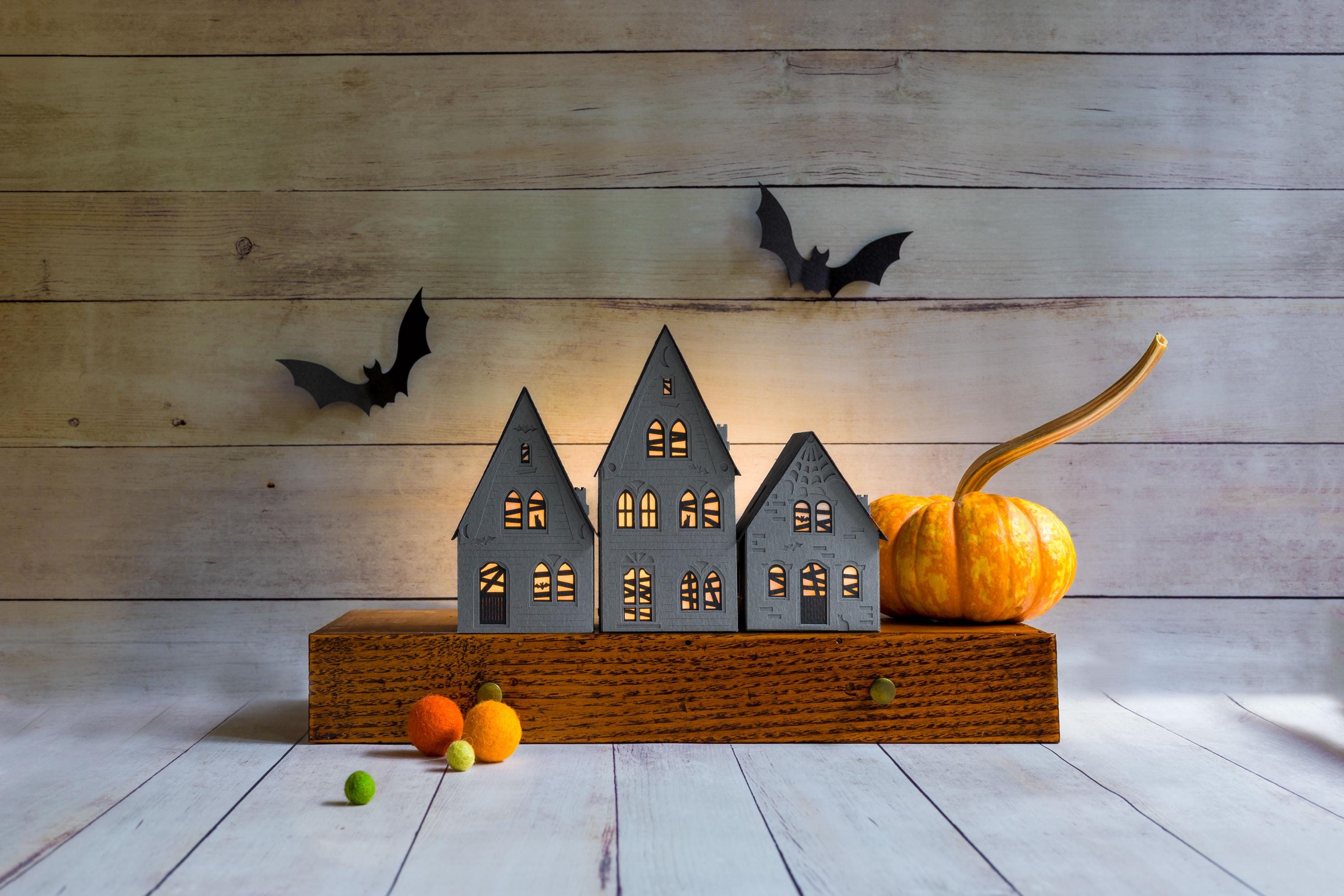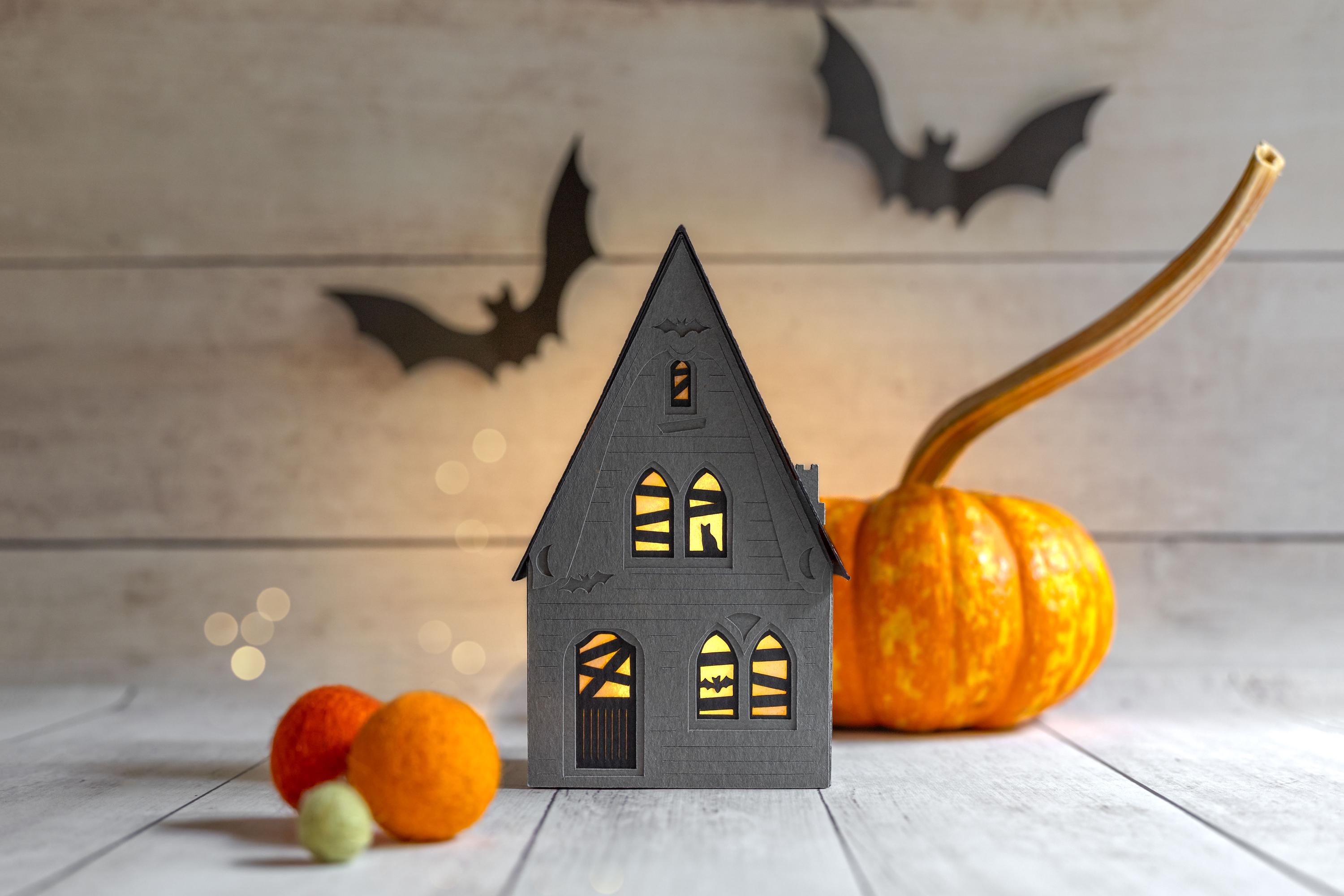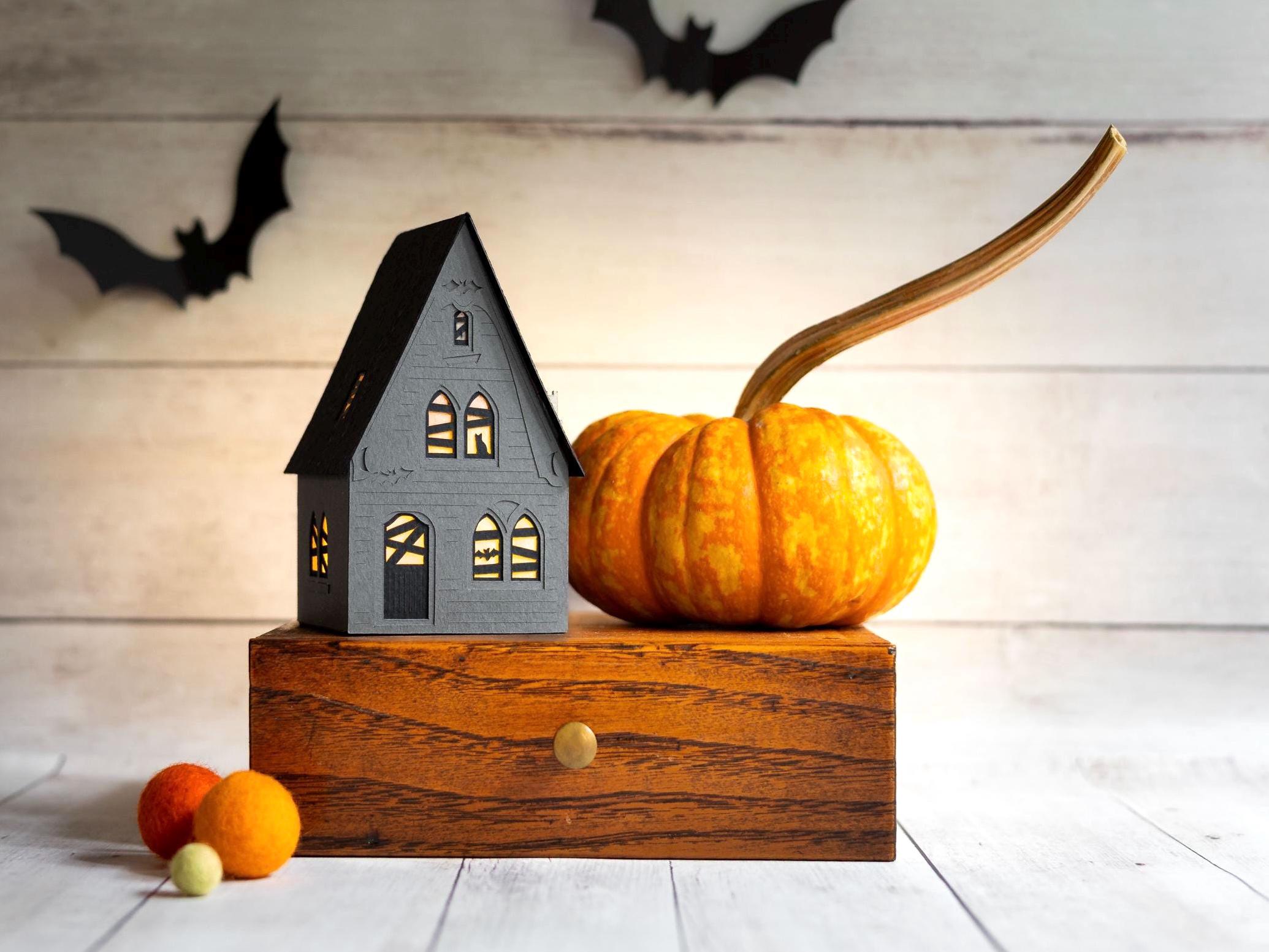 Delightfully spooky with boarded-up windows and glowing door planks, plus bats, cats, and crescent moons, the farmhouse is handcrafted from carefully cut, midnight gray paper -- the perfect shade to show off every eerie detail. I assemble every piece by hand, adding layers of meticulously cut midnight-gray paper (the perfect shade to show off every refined detail), until every piece is literally ready to shine. The layers also add strength and durability, so the luminaries are built to last through the years.