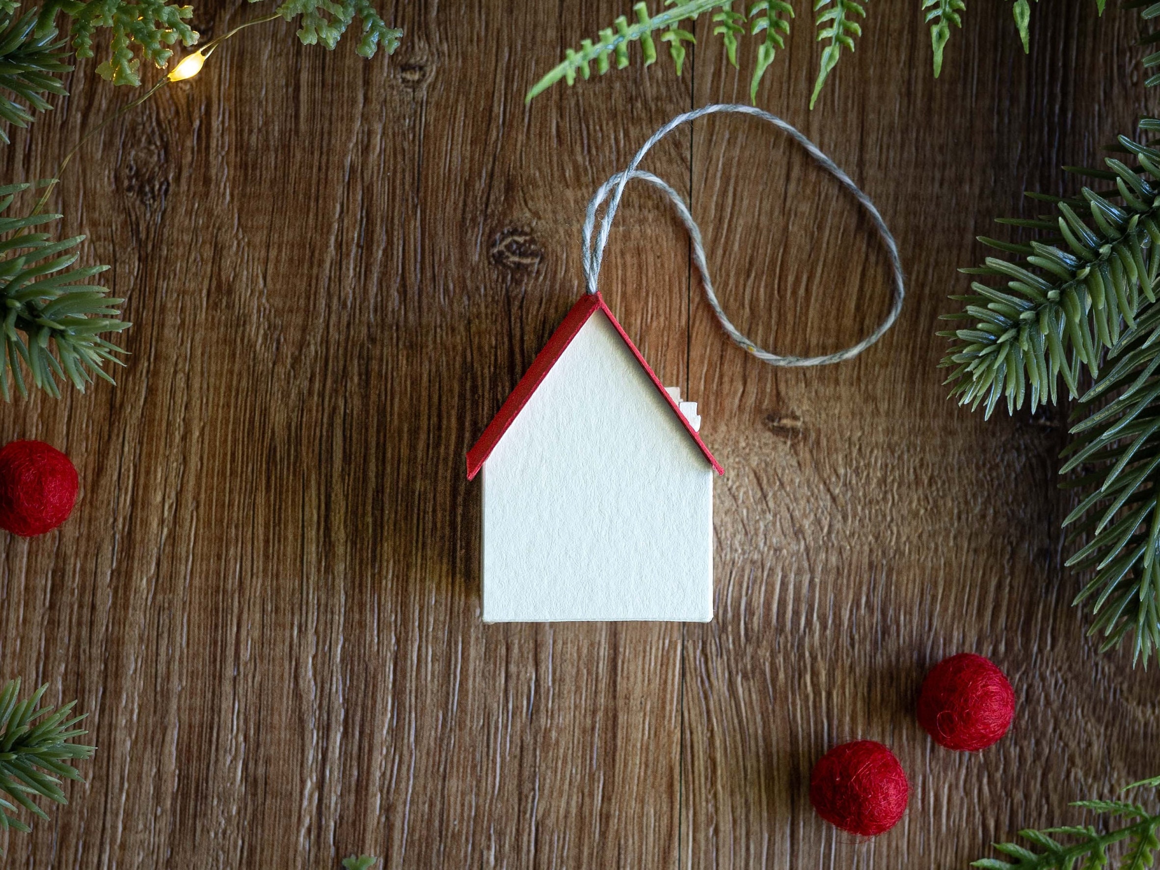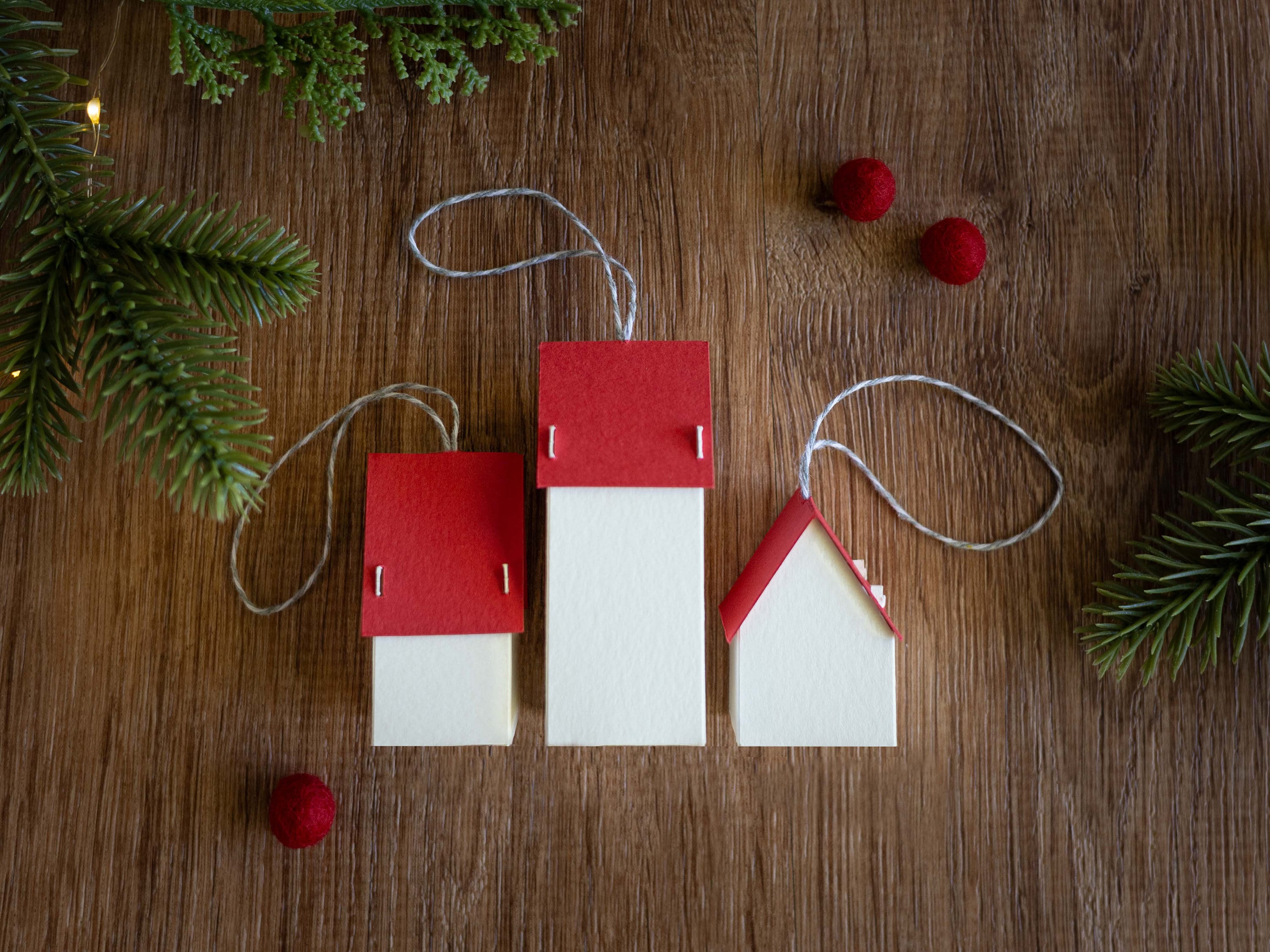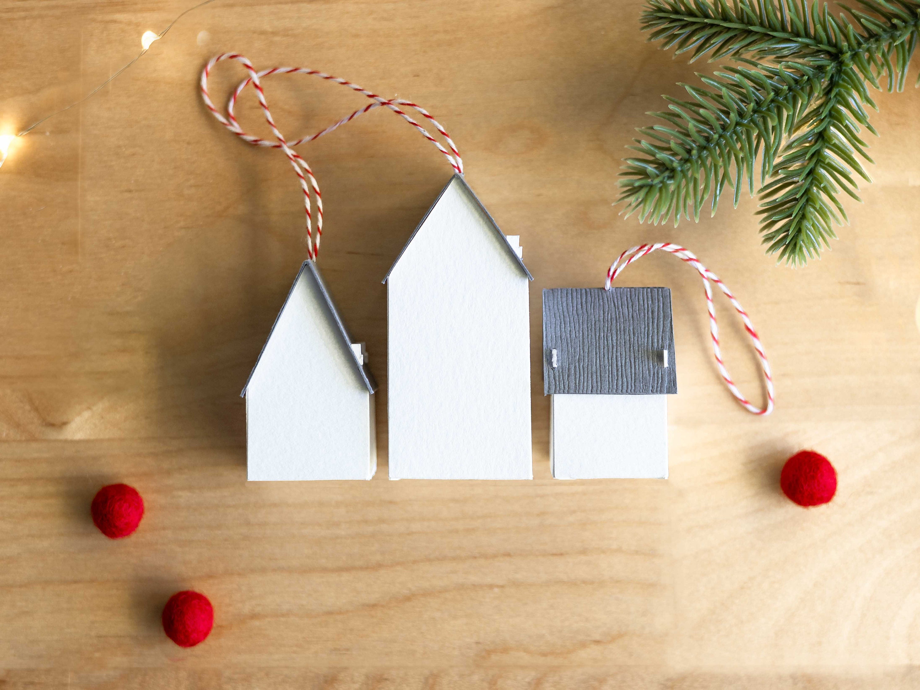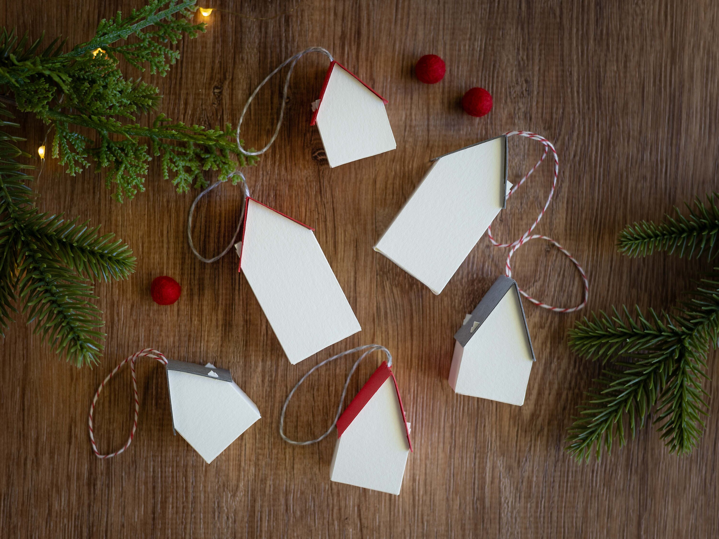 Handmade from creamy watercolor paper and accented with baker's twine, the ornaments range from 1.5 to 2.75 inches. Their tiny chimneys and minimalist facades are irresistible, and they look fabulous no matter which way they spin.