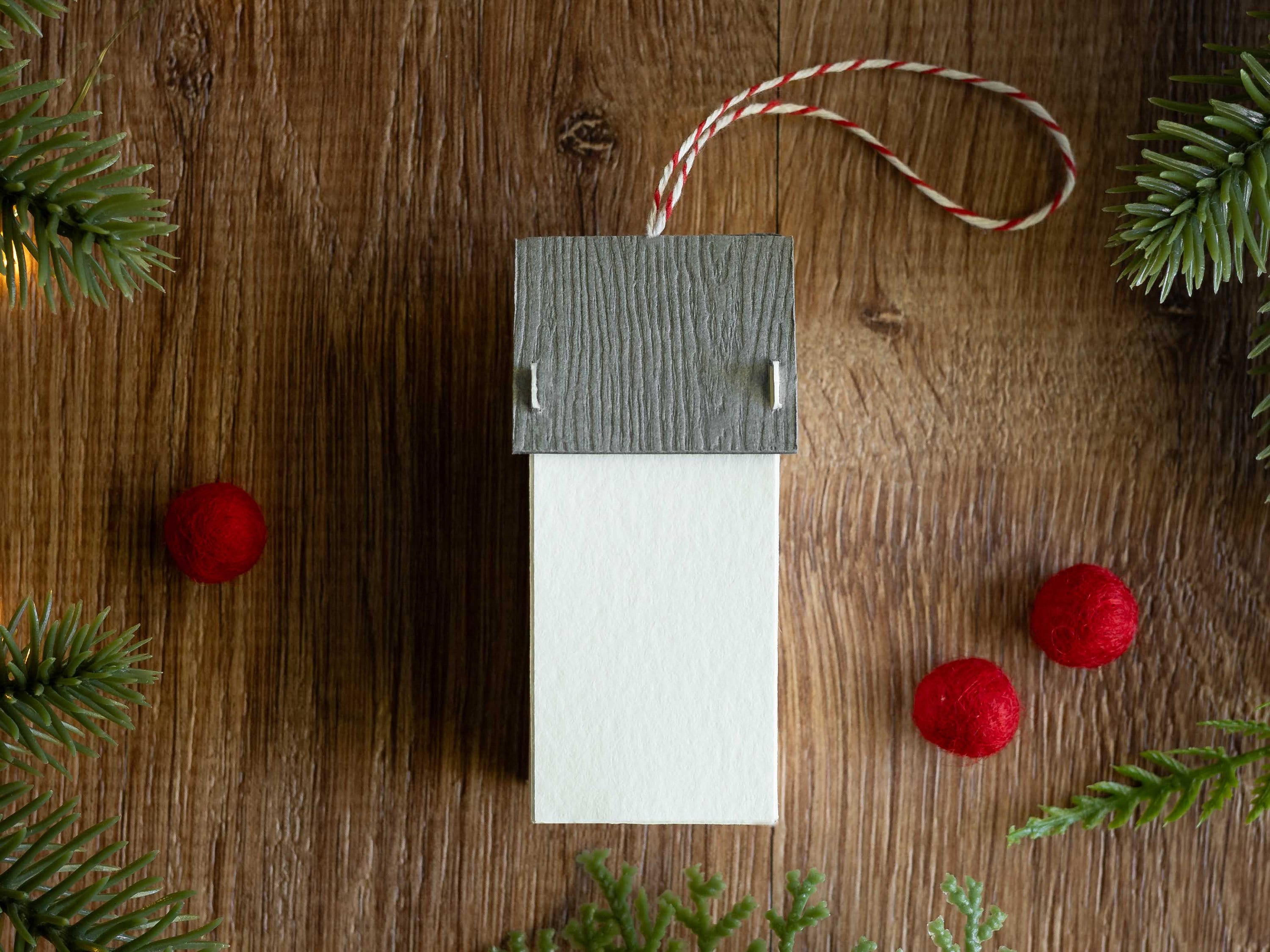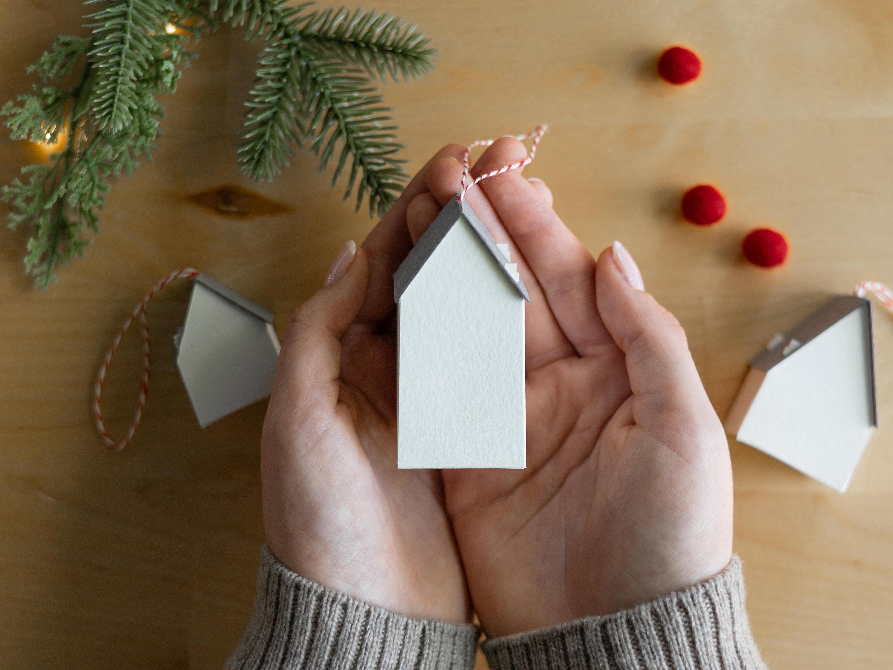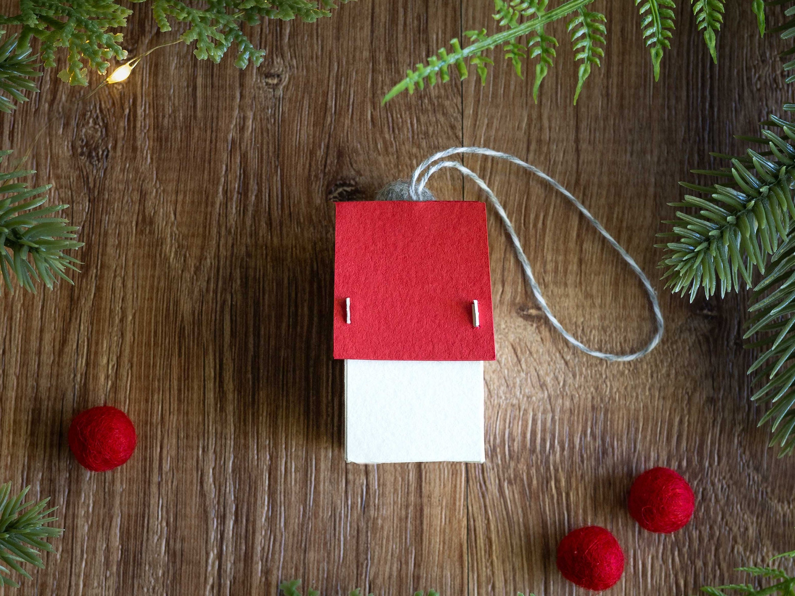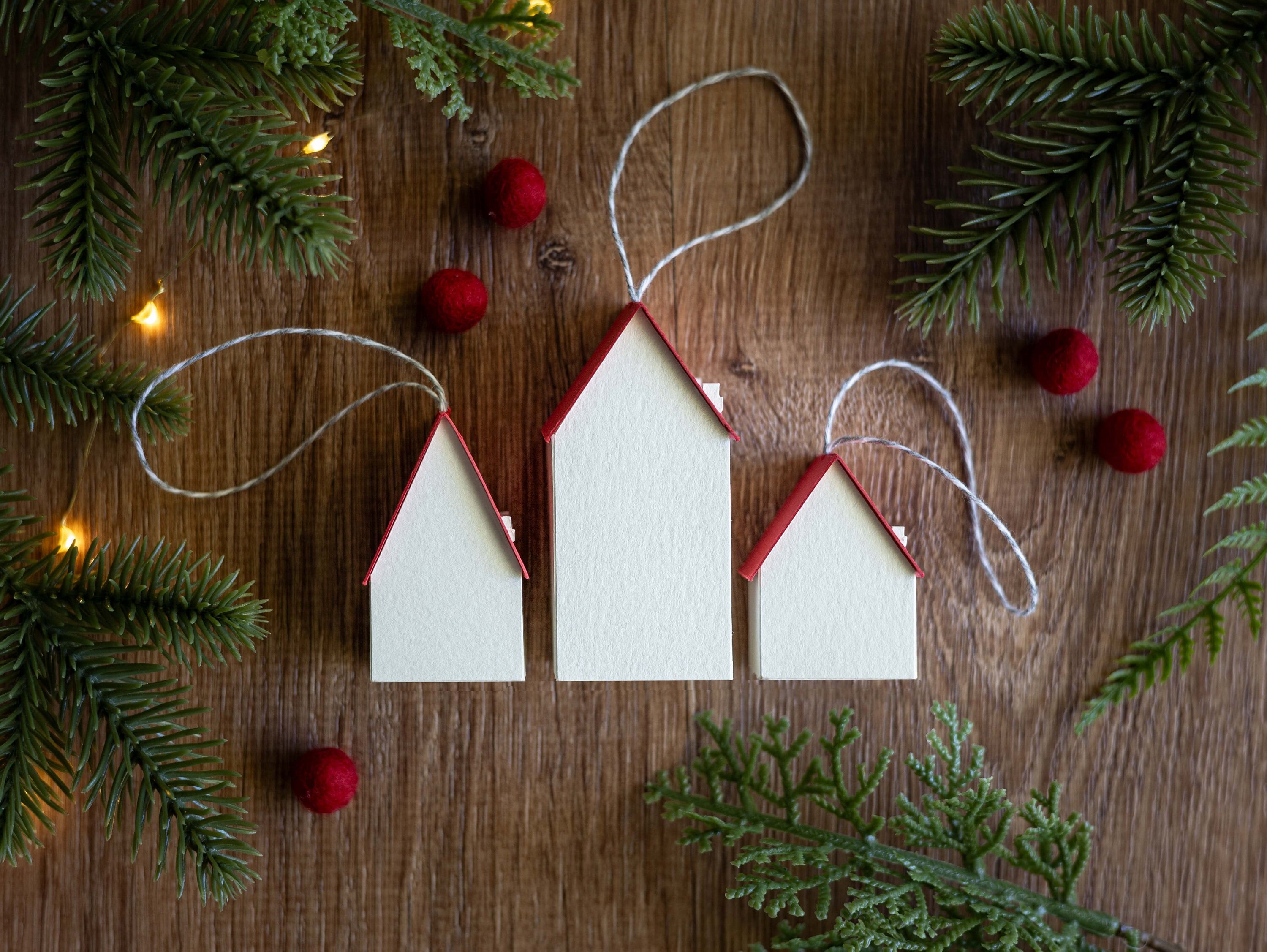 Handmade from creamy watercolor paper and accented with baker's twine, the ornaments range from 1.5 to 2.75 inches. Their tiny chimneys and minimalist facades are irresistible, and they look fabulous no matter which way they spin.