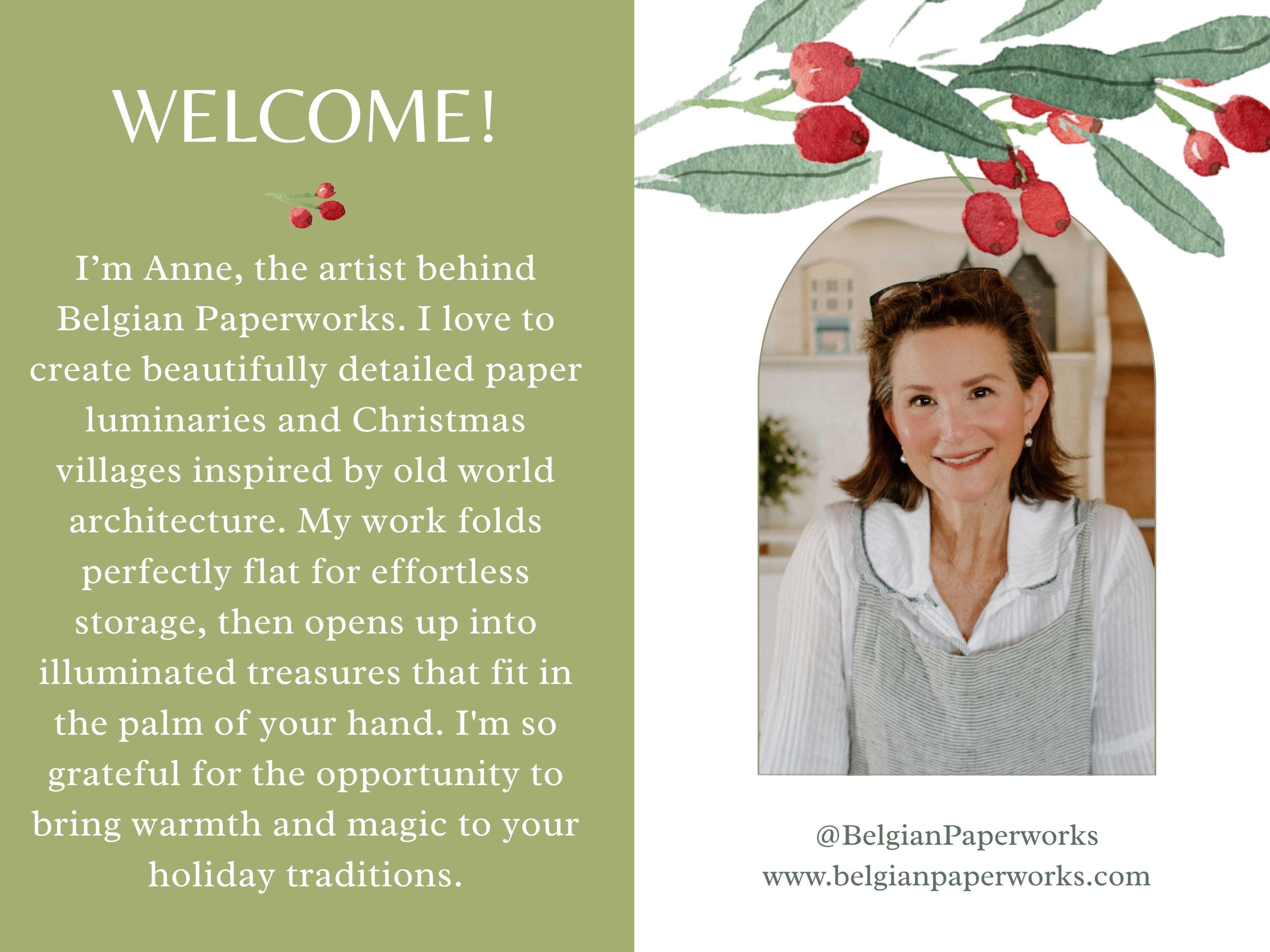 Belgian Paperworks luminaries celebrate the artistry of paper and light. Handmade from strong, beautifully textured watercolor paper, these heirloom pieces delight with intricate details by day, and enchant with a magical glow when lit — illuminated treasures that fit in the palm of your hand.