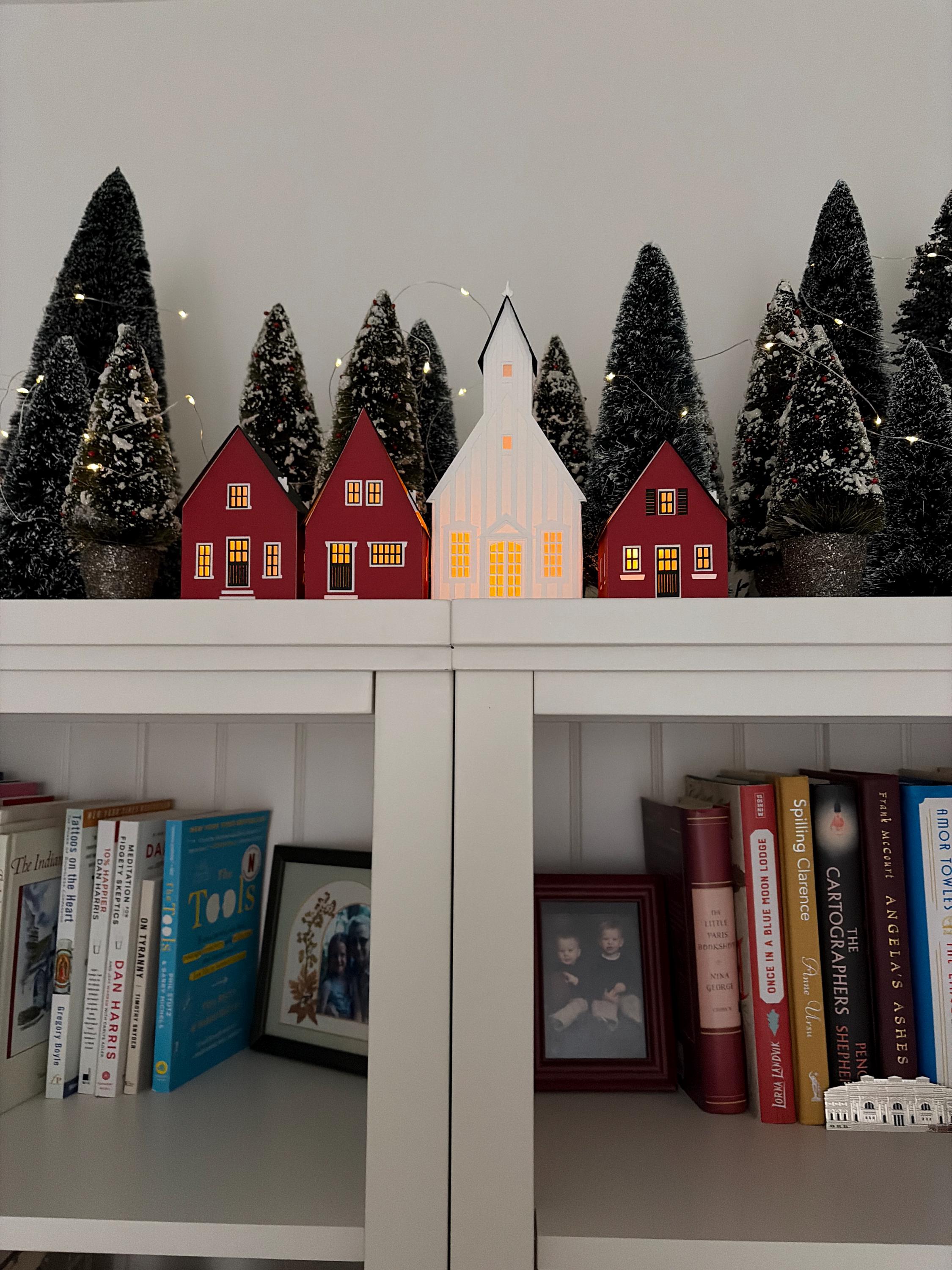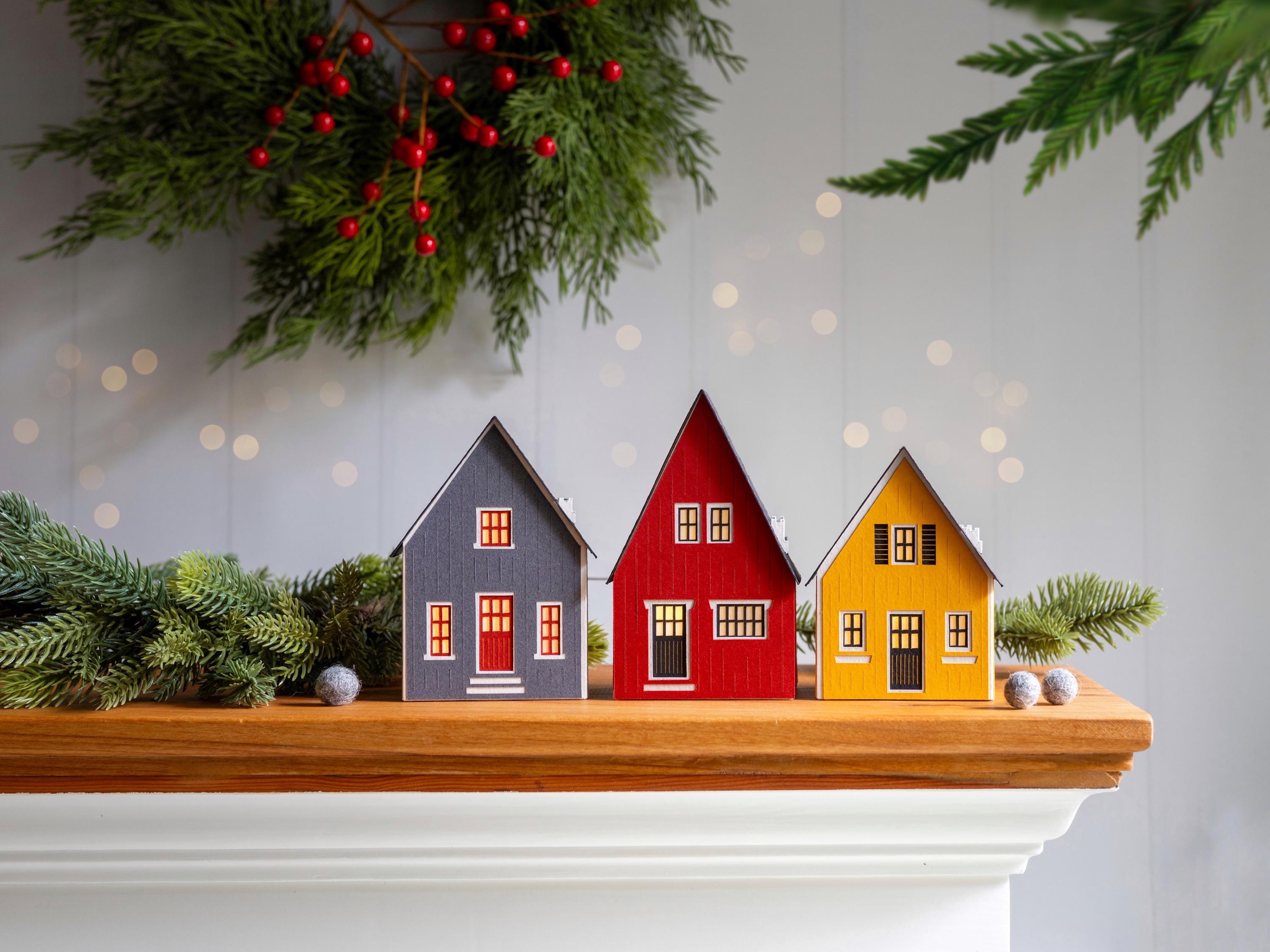 Inspired by cozy Scandinavian cottages, this handcrafted paper luminary set includes three tealight houses in traditional colors, with a Nordic church available to complete the scene. Best of all, the entire village folds perfectly flat, so you can tuck it away in seconds and your post-holiday cleanup is done. So simple!