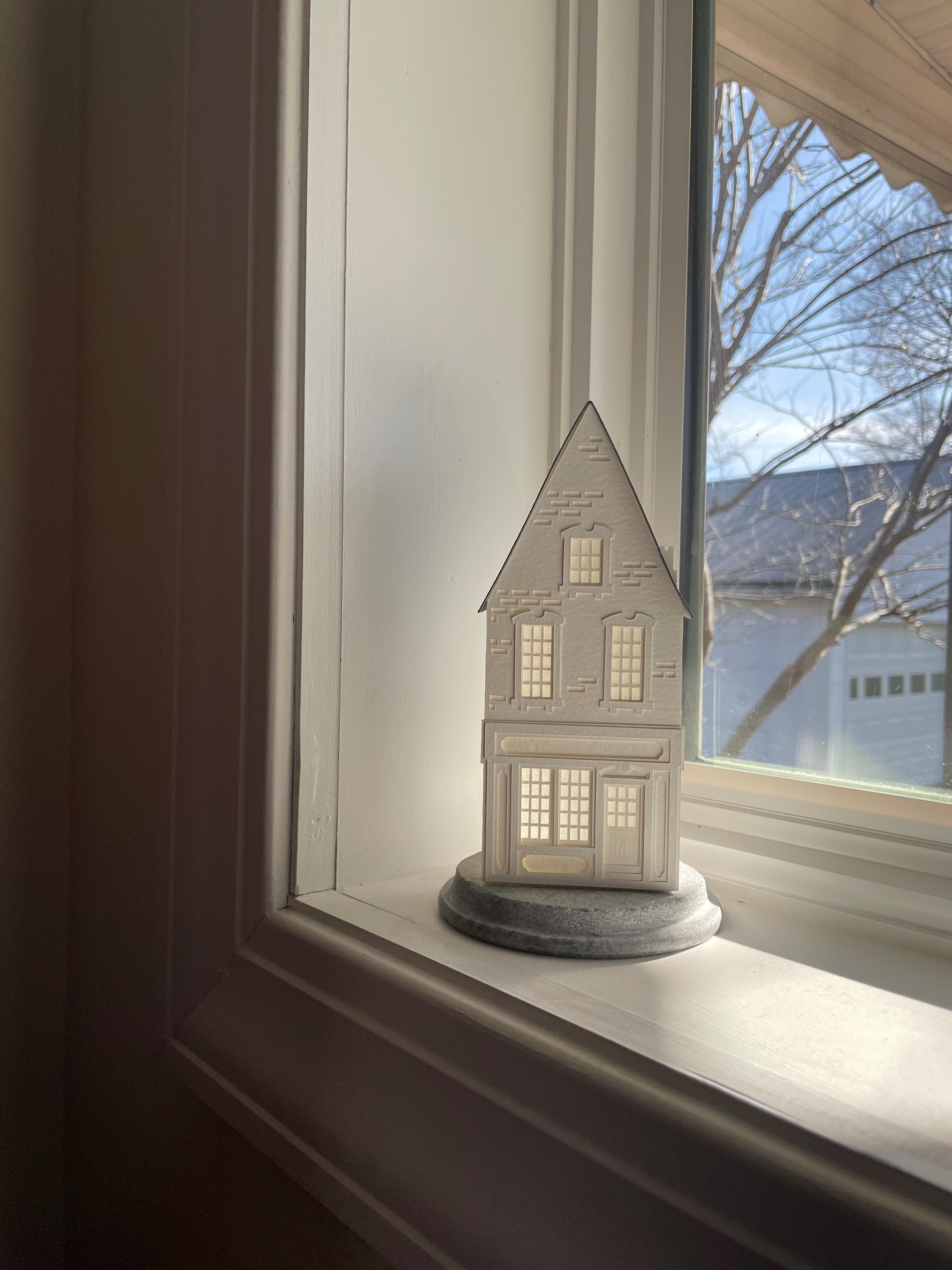 Featuring a brick facade, sweet chimneys, and giant shop windows with layers of trim, you'll want to zoom in on every delightful detail. Watch closely as evening falls, and you will see: that's when a Belgian Paperworks luminary really shines.