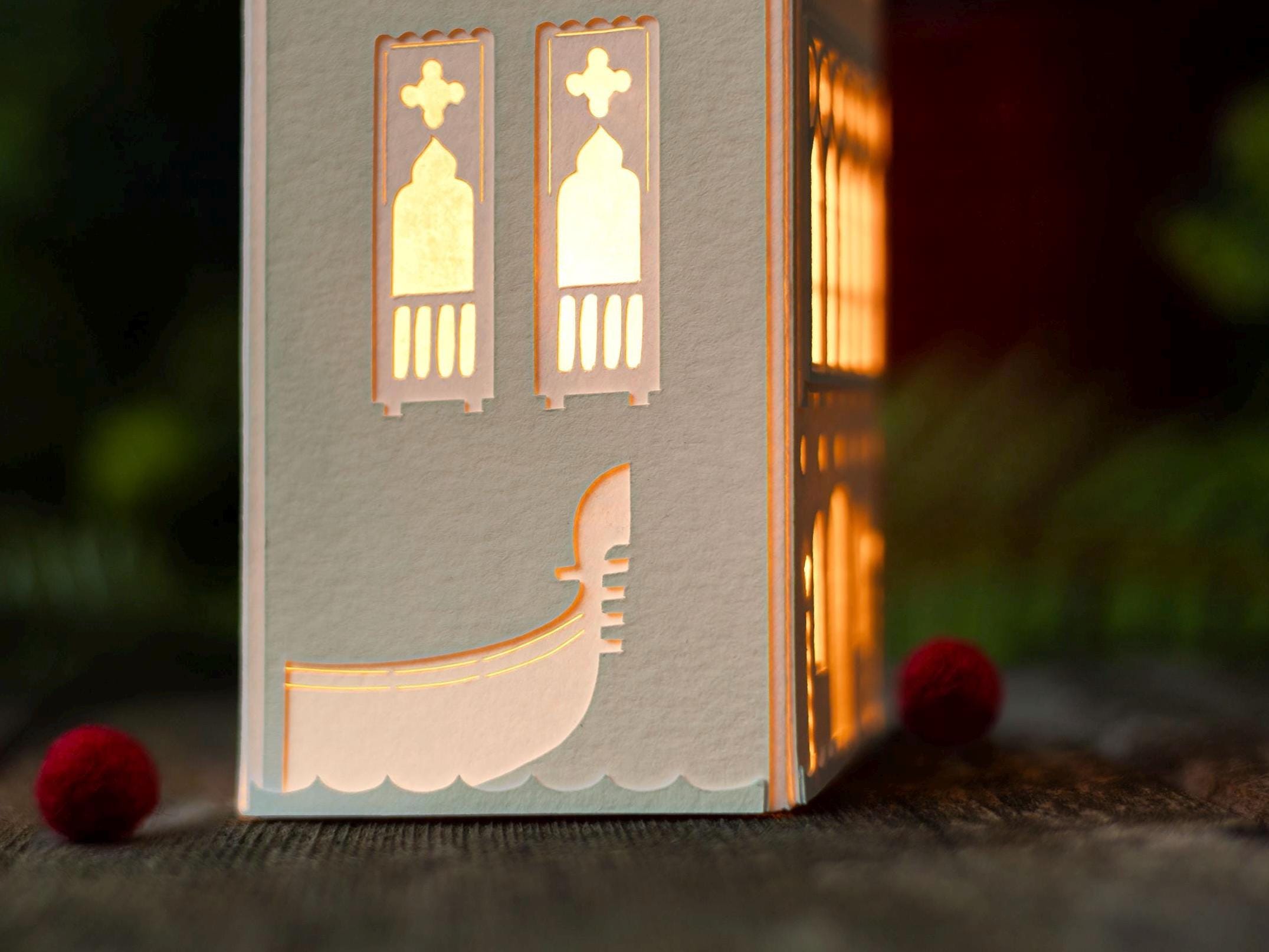 The luminary's intricate details -- from its ornate watergate (the water-level door typical of Venetian palazzo) and crisp balconies to the warm glow of its waterside lanterns, take on a warm radiance as evening falls. And you'll see: that's when a Belgian Paperworks luminary really shines.