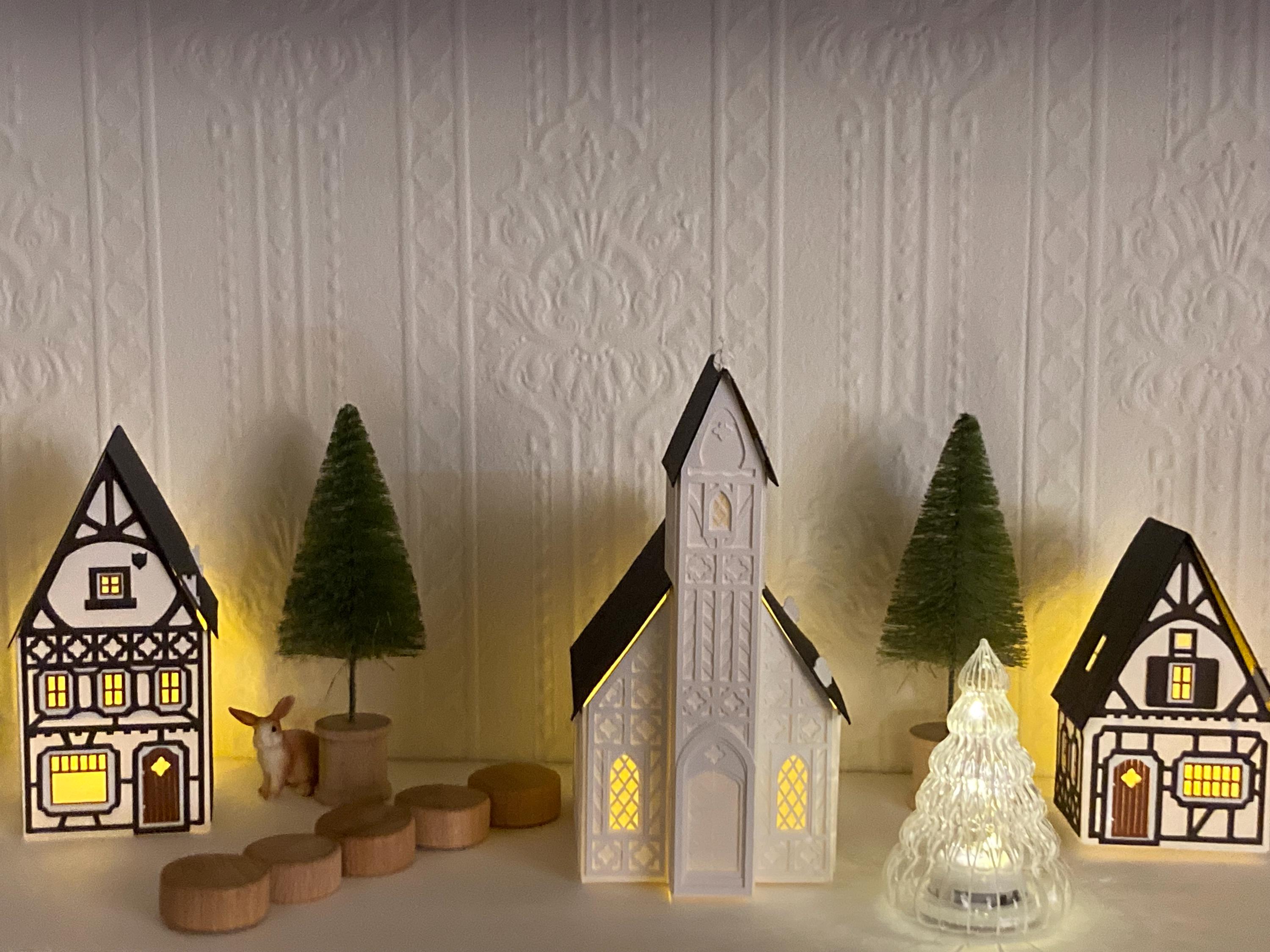 This piece was honored as a 2023 Etsy Design Award finalist. I created its charming timbers and roofs with rich, wood-grained paper. The smallest cottage has a stone-textured chimney, the stately townhouse bears a regal shield, and even the shutter is 3-dimensional.